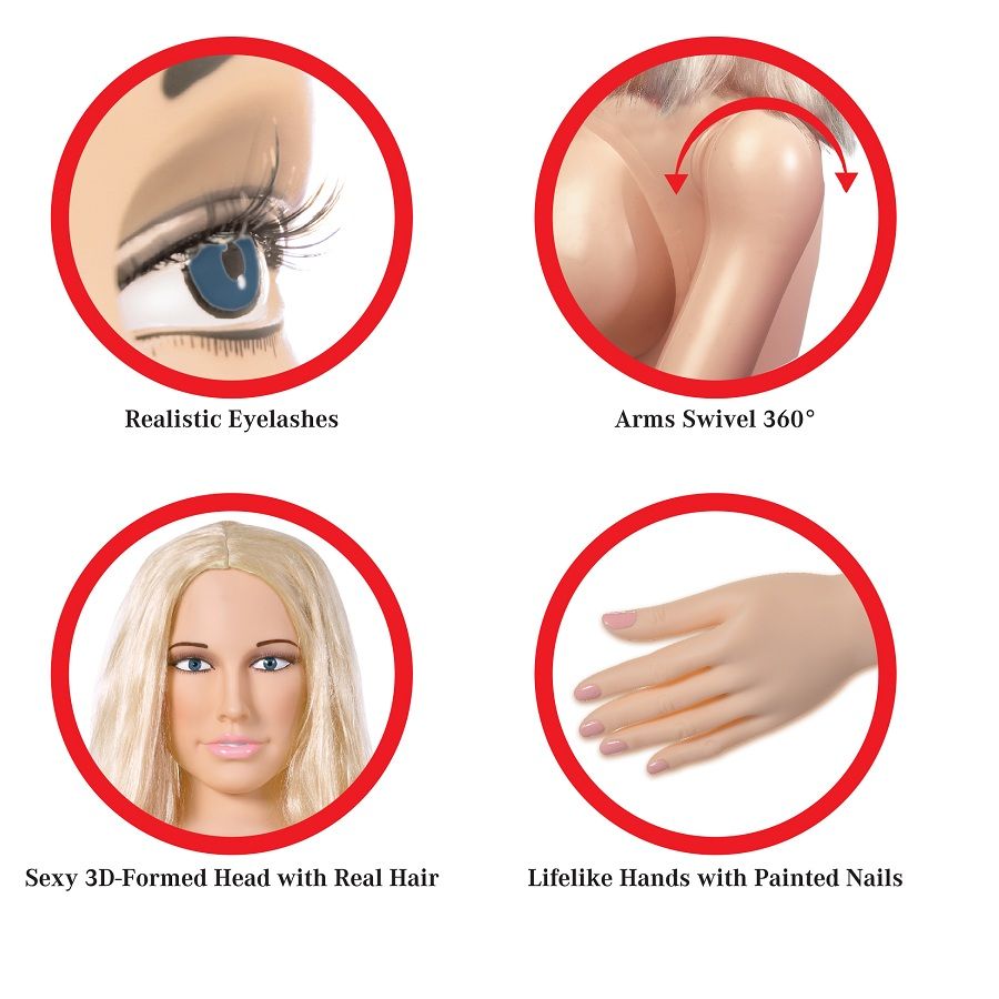 Cette incroyable poupée d'amour gonflable grandeur nature a été méticuleusement conçue avec des caractéristiques réalistes pour une expérience vraiment réaliste. Sa tête sexy en 3D présente des cils réalistes et une luxueuse tête de vrais cheveux qui ne demandent qu'à être tirés! Regardez-la vraiment prendre vie avec des bras qui pivotent à 360 degrés et des doigts et des ongles délicieusement peints. Serrez ses seins fermes et gaies pendant que vous appréciez sa peau, sa chatte et son cul Fanta-Flesh ? ultra-réalistes qui se sentent encore mieux que la vraie chose! La chatte et le cul Fanta-Flesh ? sont amovibles pour un nettoyage en profondeur facile et peuvent même être appréciés séparément pour la masturbation. Une pompe de gonflage, un kit de réparation de vinyle et des instructions sont inclus.